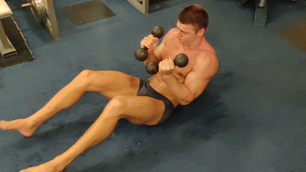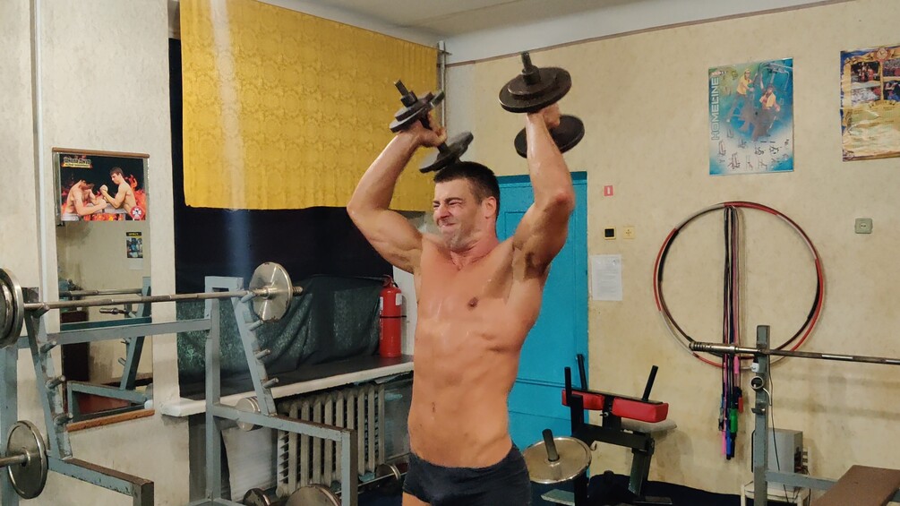 He made a 70 mins long workout video in his own gym. In the gym there is no AC, and outside the temperetaure was over 30 Celsius, therefore in the gym was very heat, about 35 Celsius. In this heat made Alex L. a heavy workout, therefore he sweated very lot.